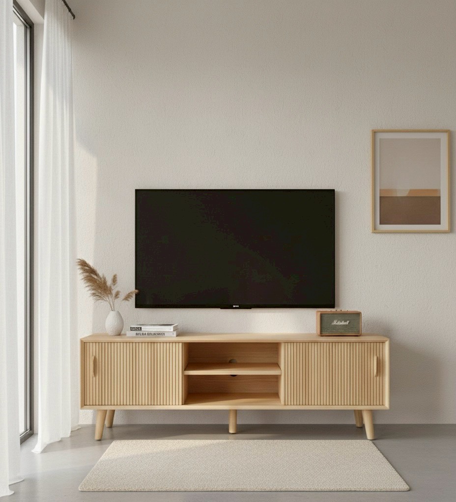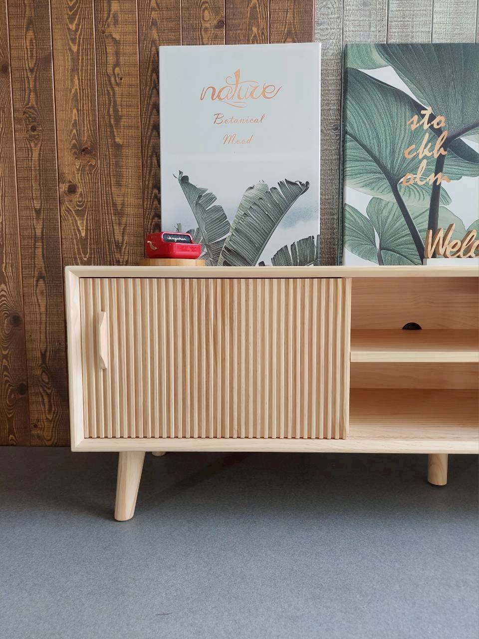 簡約風電視櫃延伸了長凳收納櫃的造型工法,直接把櫃體加長變深、門片改為同排並行、讓門片可以自由推拉、空間使用上更為靈活、拉門使用滑輪設計、活動時更輕巧、以硬質梣木做為滑輪導軌、可以降低滑輪滑動時所產生的噪音、層板三段式上下調整、也有防呆止滑溝槽設計